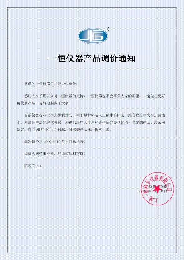 大家好,接一恒廠(chǎng)里通知,十月一號(hào)后,一恒產(chǎn)品正式調(diào)價(jià), 如有未完成訂單,請(qǐng)盡快在國(guó)慶節(jié)前完成,以免給您造成預(yù)算不足,耽誤設(shè)備的采購(gòu)