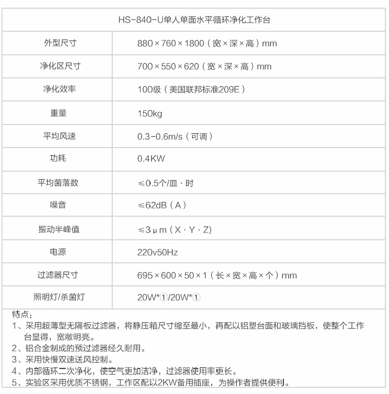 蘇州智凈單人單面(水平)循環(huán)風(fēng)潔凈工作臺(tái) HS-840-U